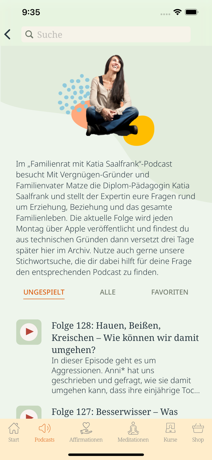In dieser App von Katia Saalfrank findest du ausgewählte und von Katia selbst erstellte bindungs- und beziehungsorientierte Inhalte (Hördateien, Meditationen, exklusive Podcasts), die dir helfen, in Verbindung zu dir selbst und deinem Kind zu bleiben und dich bei der Gestaltung einer konstruktiven Beziehung unterstützen. Die wertvollen Inhalte in der App werden laufend ergänzt, so dass du immer wieder neuen Content von Katia finden wirst. Die App ist auch interaktiv angelegt, du kannst dir z.B. Affirmationen in dein Familienleben schicken lassen. So ist die App für DICH mit viel Liebe zum Detail gestaltet und voller Hingabe mit wertvollen Inhalten gefüllt.