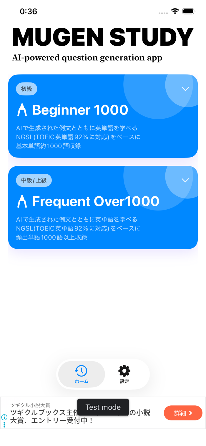 TOEIC 対策向けの「MUGEN STUDY」は語彙学習アプリ。NGSL をベースに、AI 生成の短い例文付き四択クイズで学習できる。このアプリは TOEIC 語彙の約 92%をカバーし、学習に役立つ例文を提供し、四択クイズ形式で語彙力を向上させる。