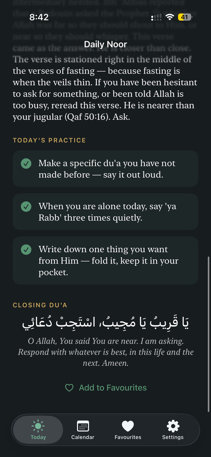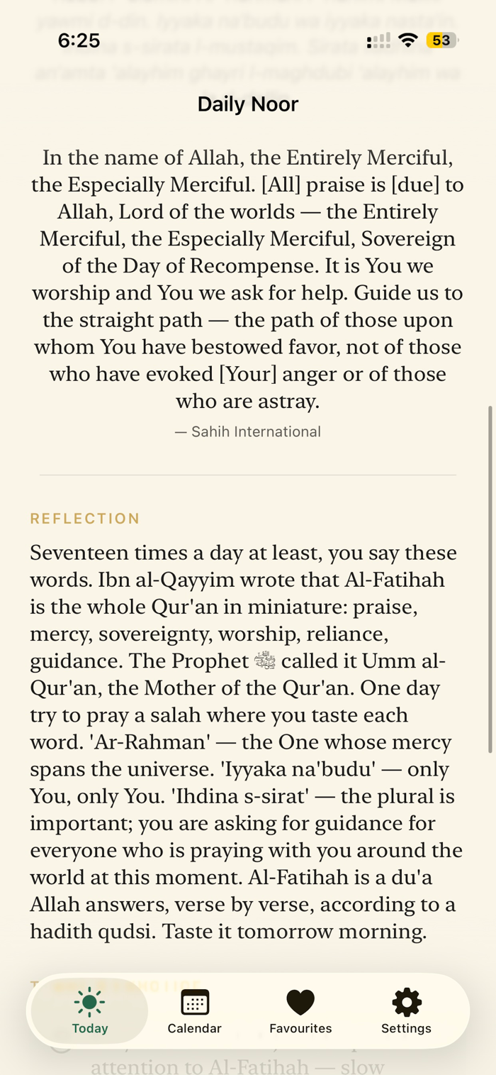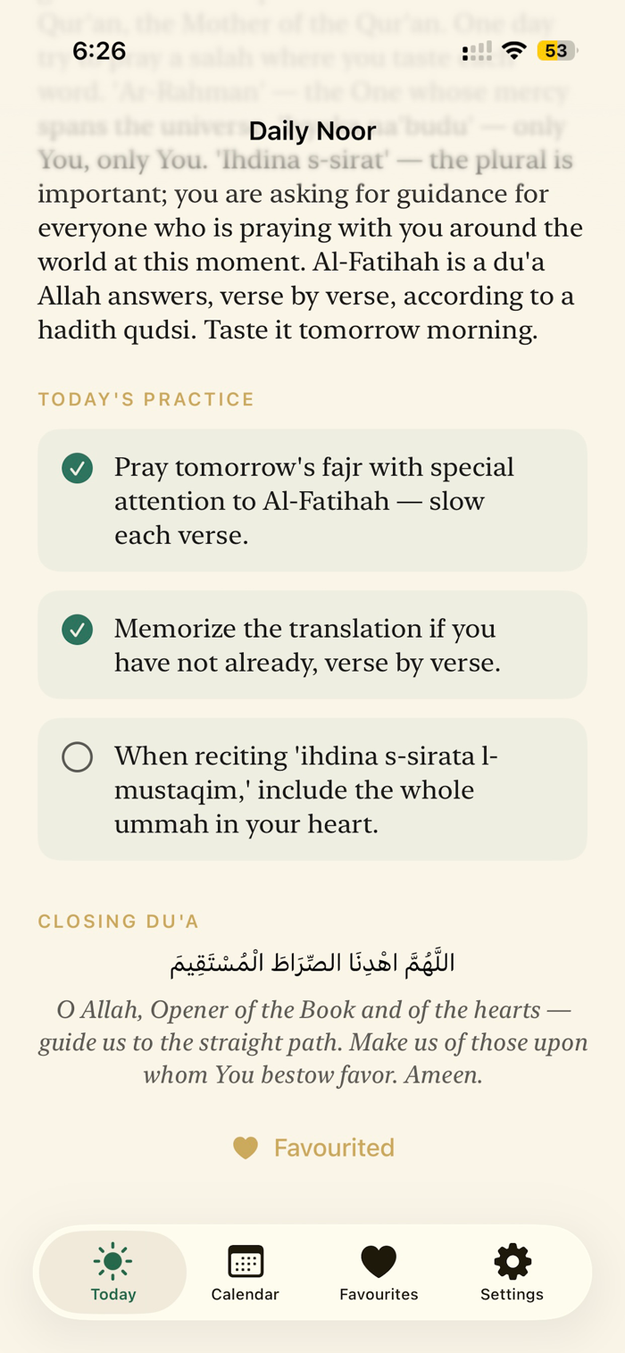 Whether you are a lifelong Muslim looking for a gentle daily rhythm, a revert getting to know the Quran, or someone who simply wants a moment of stillness in the middle of a busy day, Daily Noor is designed to meet you where you are. Five minutes. One ayah. One small step.