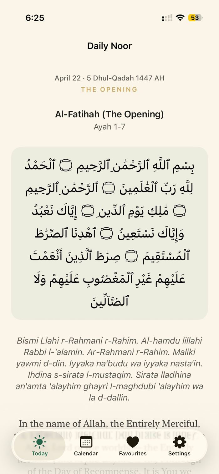 Daily Noor is a calm, beautifully designed daily companion for the Quran. Every day, open the app to find one curated ayah with its Arabic text, an English translation, a warm reflection, three small practical actions, and a closing dua. That's it. No endless feeds, no ads, no accounts, no noise.