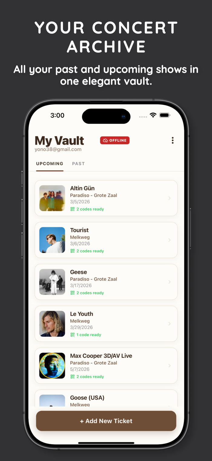 Vault让你无需在场地门口翻找邮件。它能即时存储、整理并便捷访问演唱会门票,即便无网络连接也无妨。其AI自动提取门票PDF关键信息,支持离线使用,扫描顺畅。界面简洁无广告、无杂乱内容,专注门票管理。数据私密,由音乐爱好者打造,消除“入场焦虑”,无论大型巡演还是本地演出,门票都妥善存于Vault。