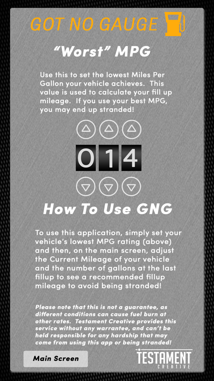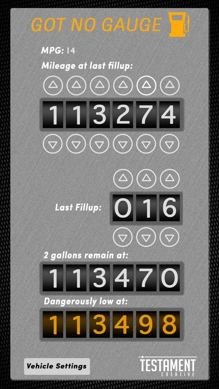 *Testament creative can't _guarantee_ you won't be stranded. We can't be held responsible for inaccurate MPG ratings, improper entry, or other errors. This application is provided as a helpful utility to assist you with avoiding being stranded due to a faulty gas gauge!