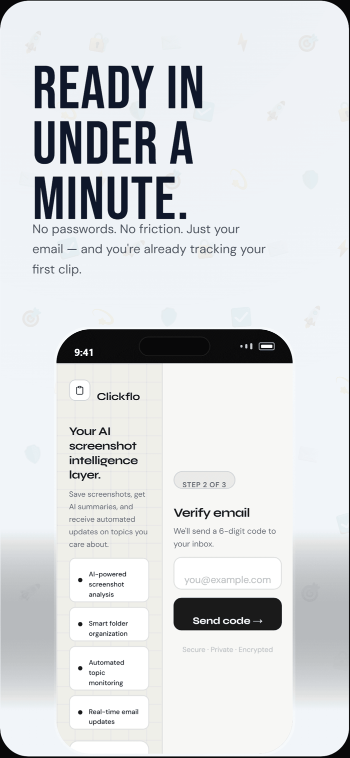 See something worth tracking? Save it. Clickflo’s AI instantly reads your screenshot, identifies the topic, files it into smart folders, and monitors the web for updates - all automatically.