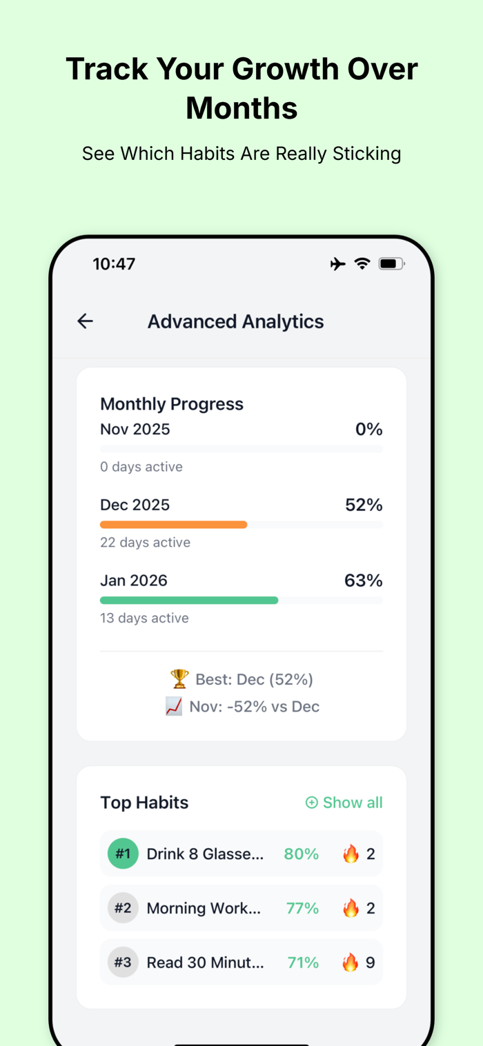 Most habit trackers only count streaks. H goes deeper: we track your consistency score and analyze your behavioral patterns to help you build lasting habits that actually stick.
