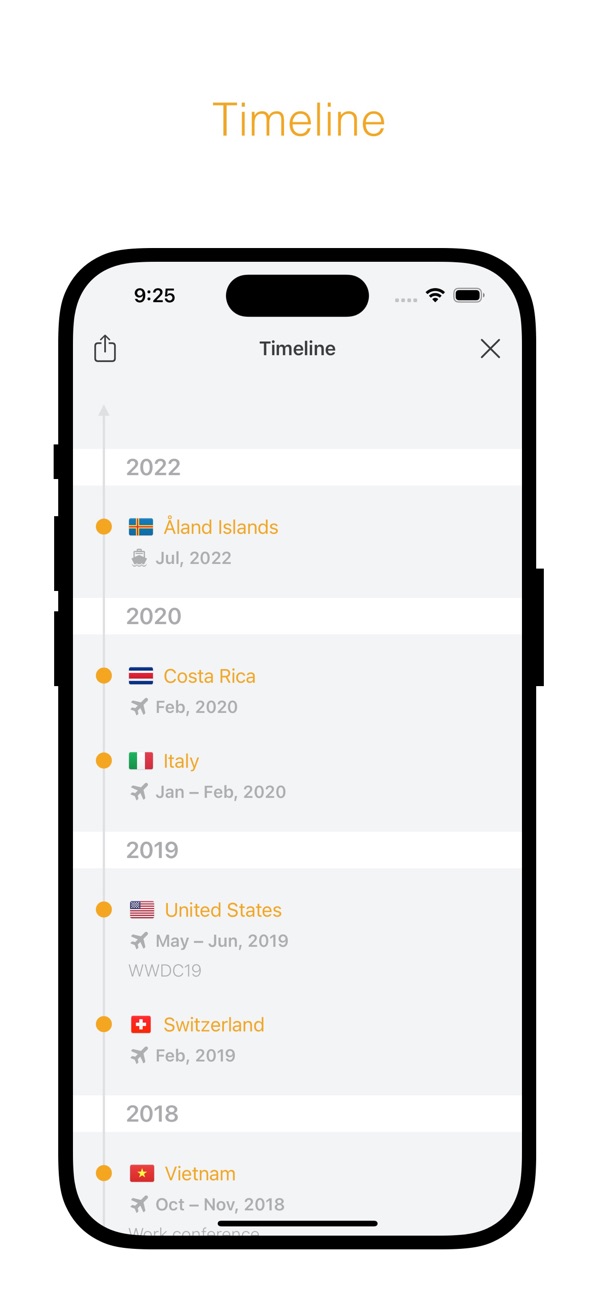 Keep track of countries and US states that you have visited, and if you wish, also when you visited. The app visualizes the visited countries both as a list, along with a ratio for each continent, and as a world map. The map can be shared on social networks, such as Instagram, Twitter and Facebook, using the standard iOS sharing functionality. You can compare your map with friends that also have the app, by sharing your map with them.