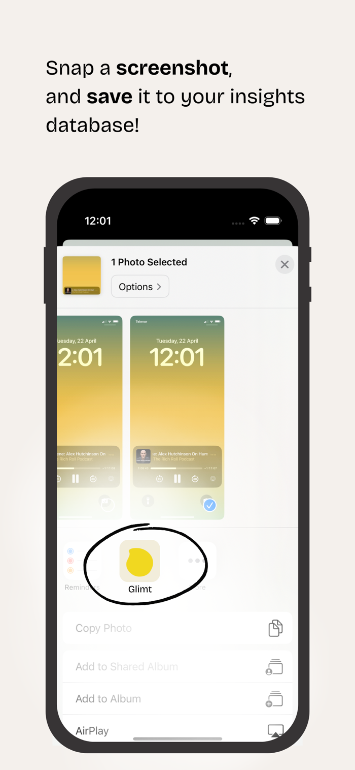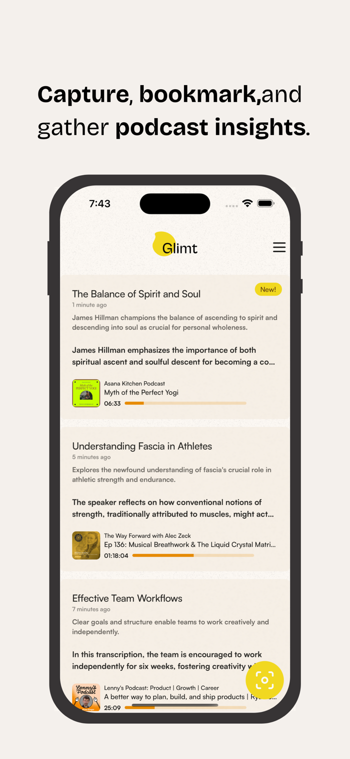 Glimt可让你轻松为播客时刻添加书签并保存见解,不会再错过精彩的播客创意。它通过截图识别你正在收听的播客,将关键见解保存到书签数据库。所有功能需付费订阅,通过苹果应用内购买设置。基础计划含书签、见解收集等,专业计划在此基础上还有存储集成等更多功能,如不同的AI积分数量、可定制片段长度等,使用遵循苹果应用最终用户许可协议。
