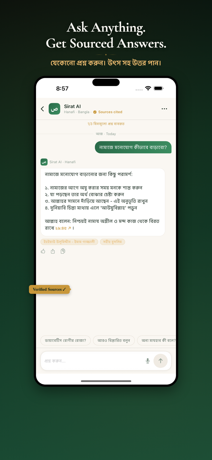 - AI-powered Islamic Q&A with source citations from Quran, Hadith, and Fiqh