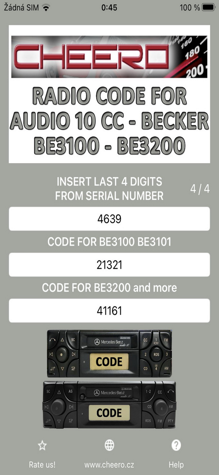 Calc CODE for RADIO - MB AUDIO 10 CC是一款用于MB AUDIO 10 CC、Becker BE3100、BE3200等汽车收音机的无限解码工具,支持MB Audio 10 CC Becker BE3100、BE3101、BE3200、BE3201、BE3207、BE3210、BE4301、BE4133等型号,购买一次即可永久使用。