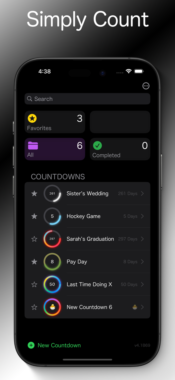 Simply add a new countdown, choose a start date and end date, and you're ready to countdown, or up.