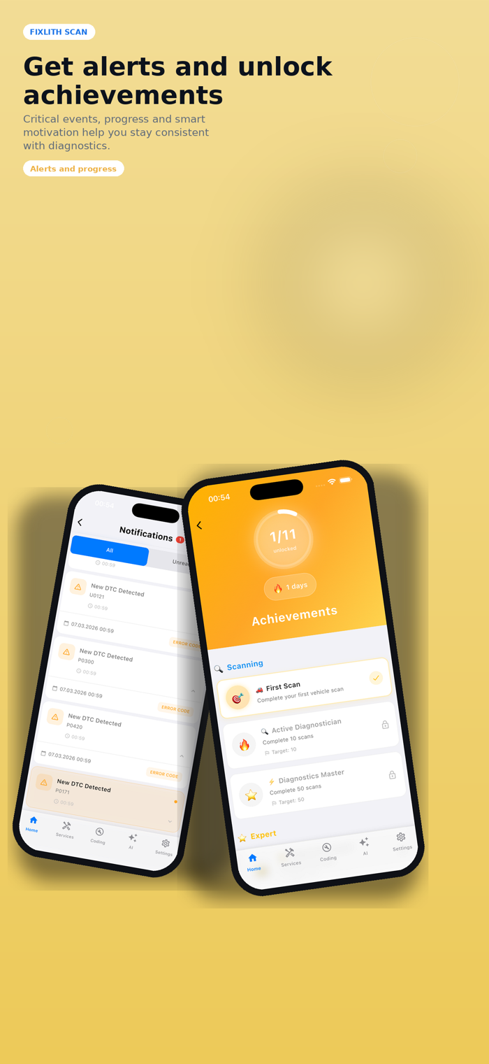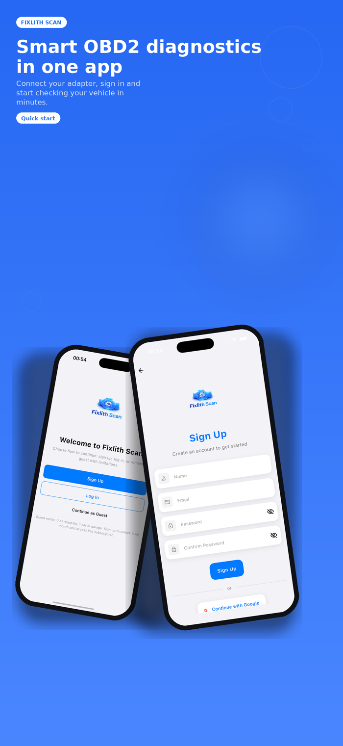 Fixlith Scan turns your iPhone into a professional OBD-II diagnostic tool. Connect a Bluetooth ELM327 adapter to read fault codes, monitor live sensor data, and get AI-powered repair recommendations.