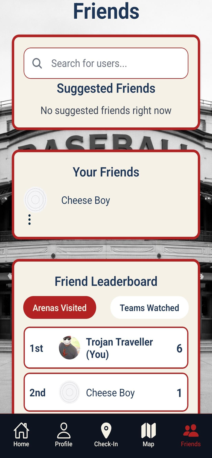 Connect with friends, react to their check-ins, and follow where they’ve been across leagues and ballparks.