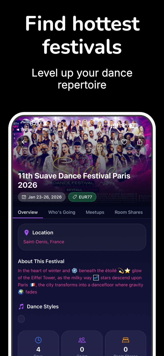 Whether you’re heading to a local social or traveling for a dance festival, DanceMate makes it easier to find events, meet like-minded dancers, and feel less alone in new cities.