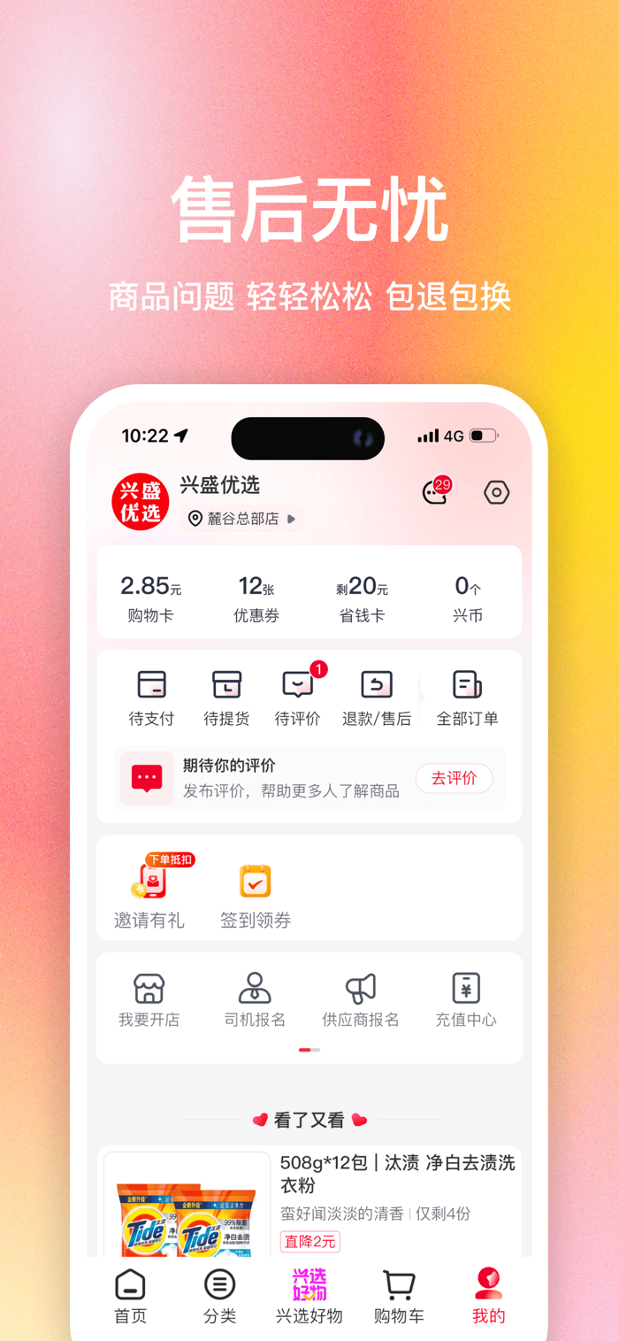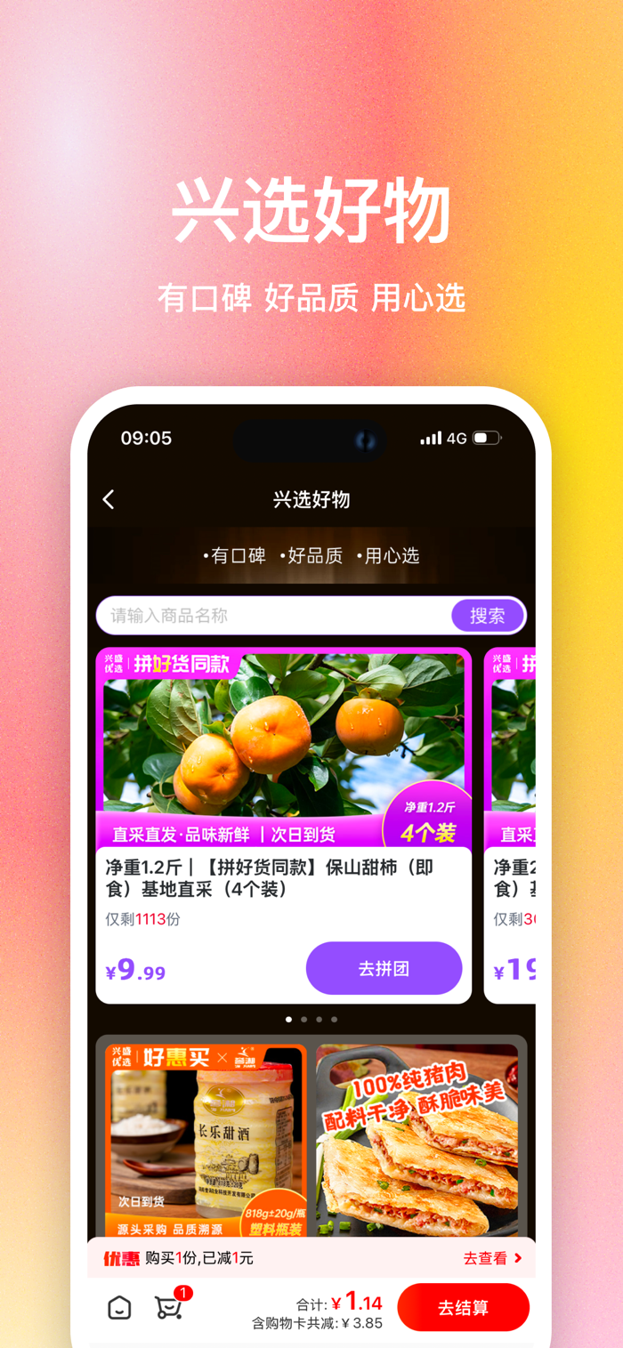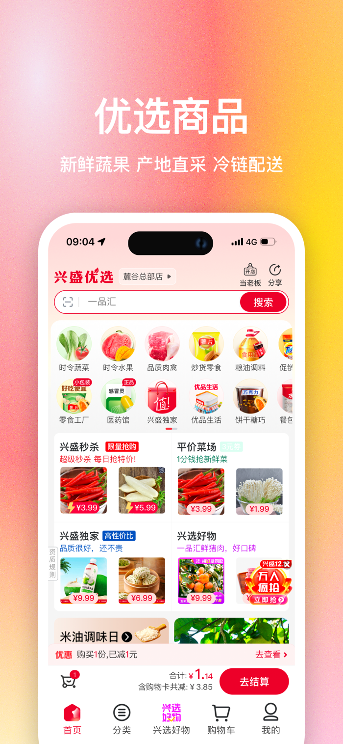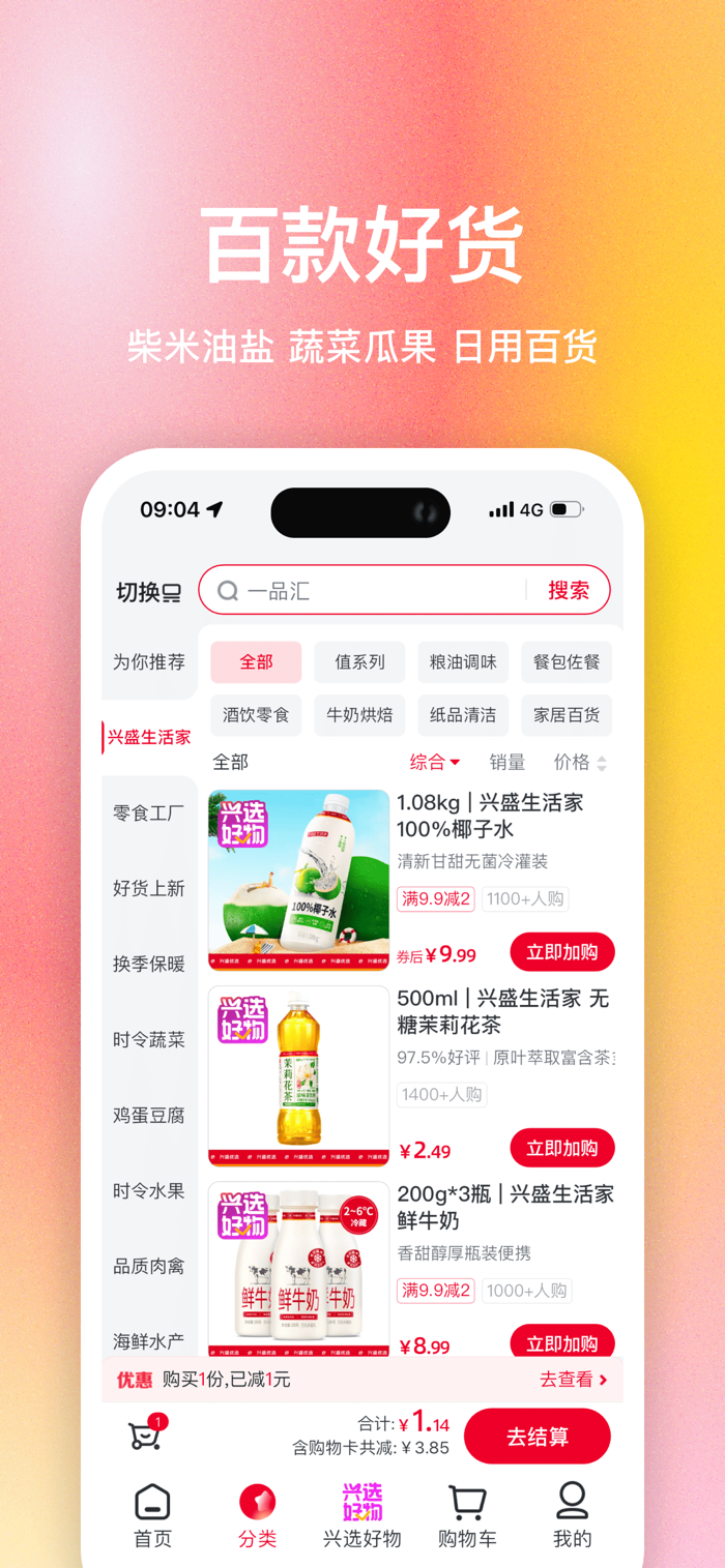 兴盛优选手机端应用软件是兴盛优选专为手机端用户推出满足日常生活消费的线上购物软件。具备商品浏览/搜索,商品购买,在线支付,在线跟踪订单,订单查询的功能,还可查看附近自提门店,让您购物更便捷,购买更省心。