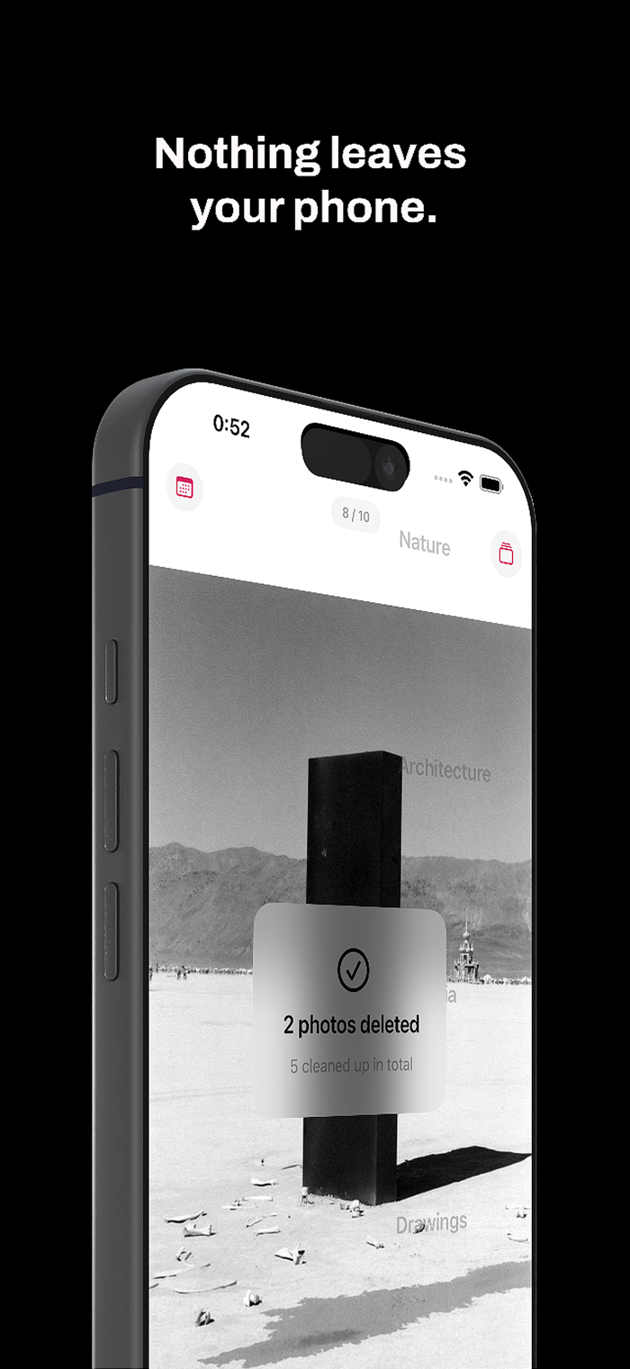 Zero networking code. No analytics. No cloud. Photos are referenced by pointer, never copied or uploaded. This isn't just a privacy policy — it's a privacy architecture.