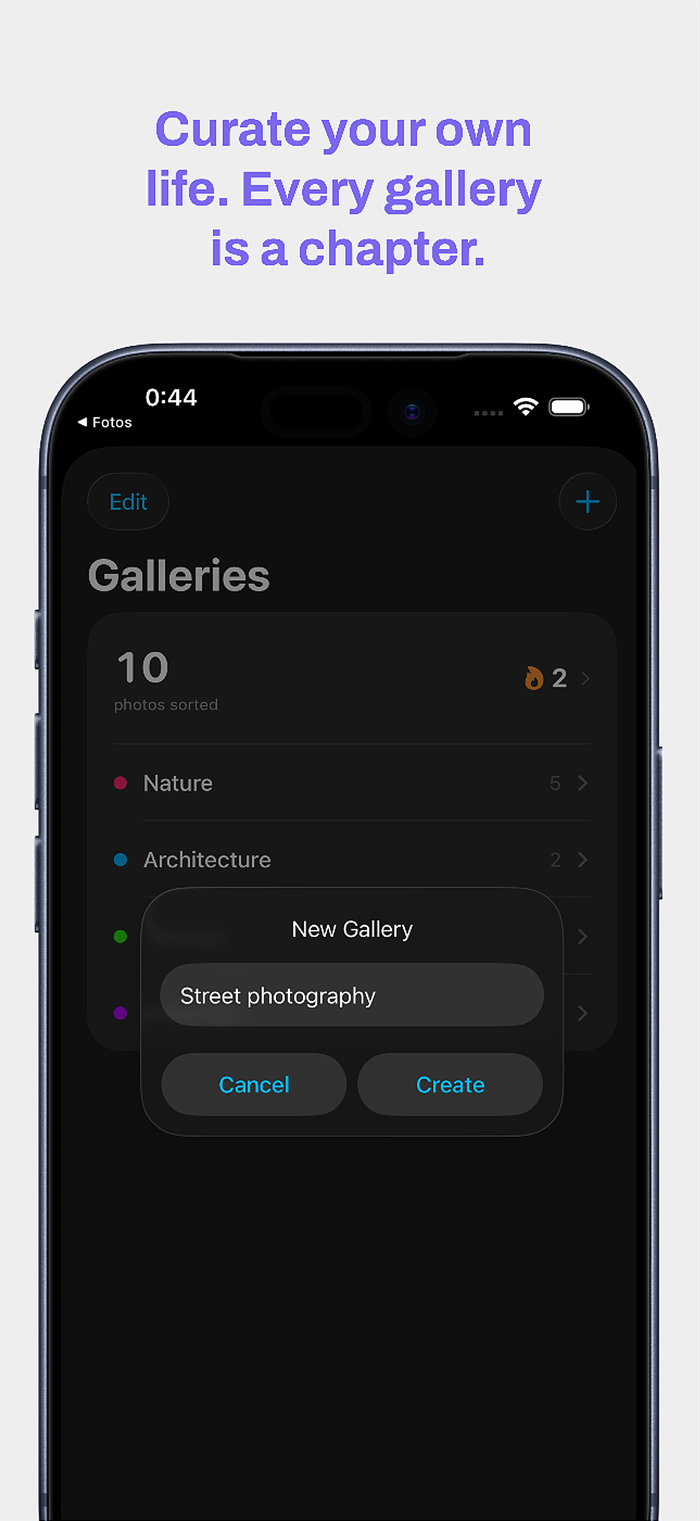 Your camera roll deserves better than endless scrolling. Culla turns the overwhelming task of organizing thousands of photos into a simple, meditative ritual. Swipe in four directions to sort, favorite, dismiss, or keep. After 30 seconds, your hands know the system — and you're just making decisions.