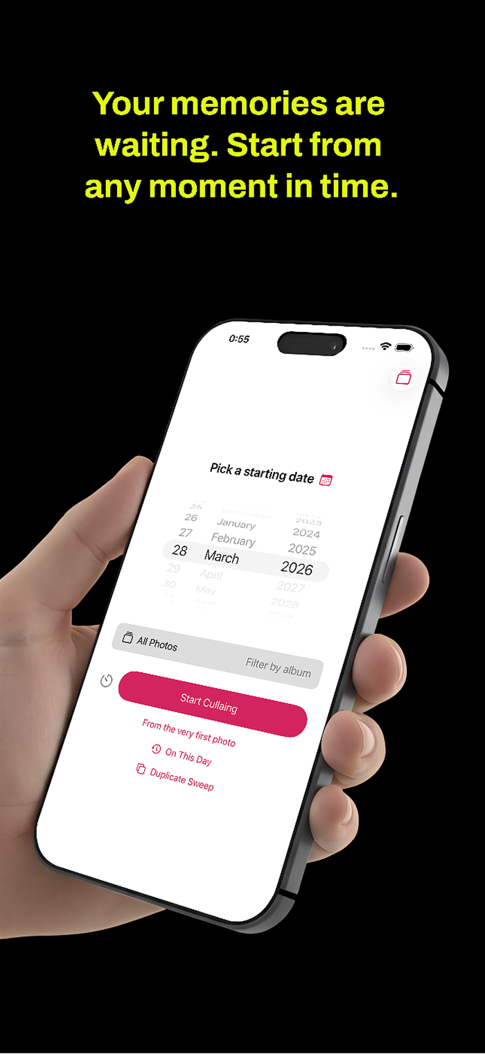 The date picker is a time machine. Start from your very first photo, or revisit what you were doing on this day years ago.