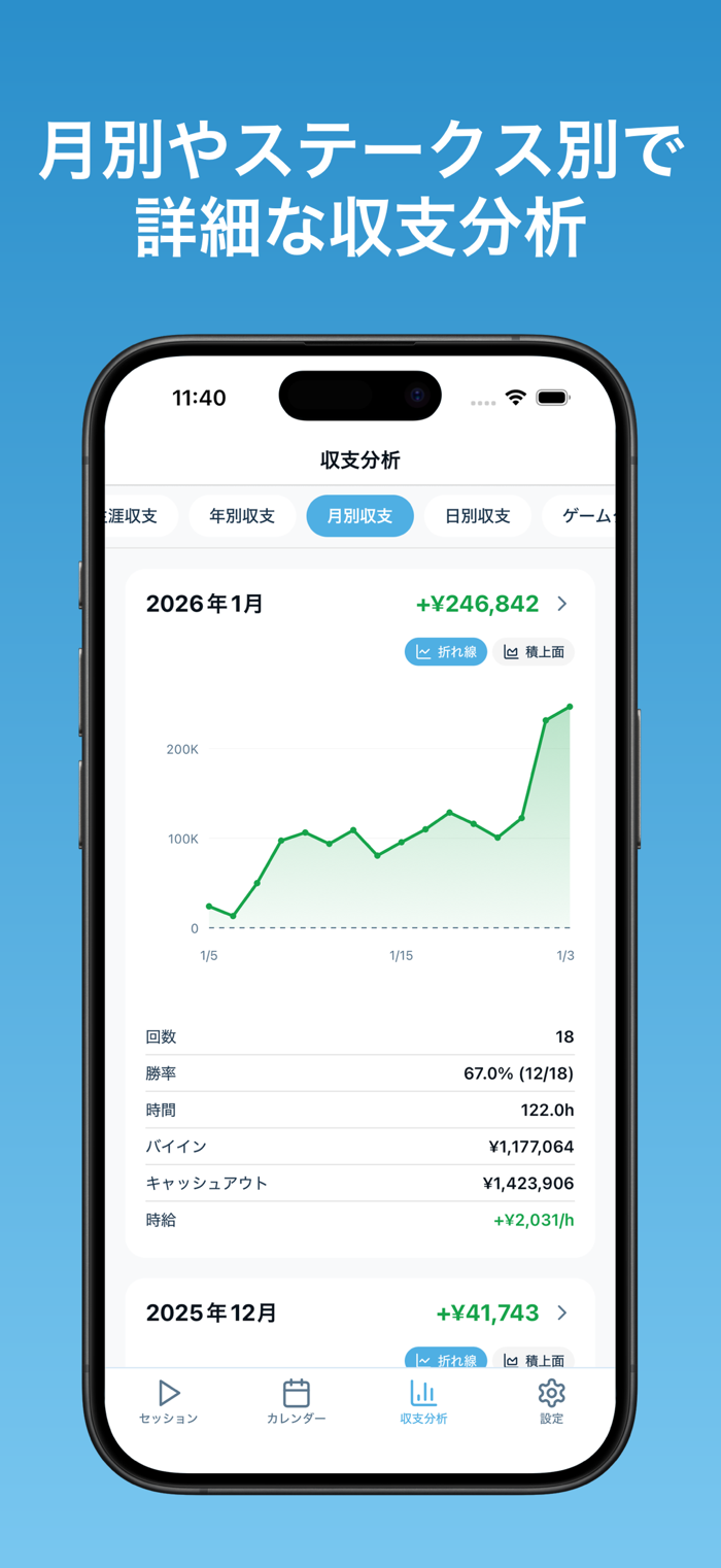 您可以在收支表和图表中按时间段和游戏类型分析您的成绩。
