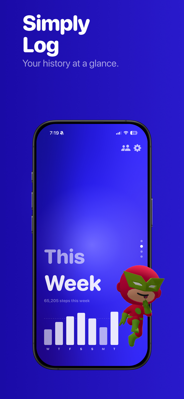 Your step count is always front and center, updating live from Apple Health. Tap to switch between steps and distance. View weekly, monthly, and yearly charts to track your progress.