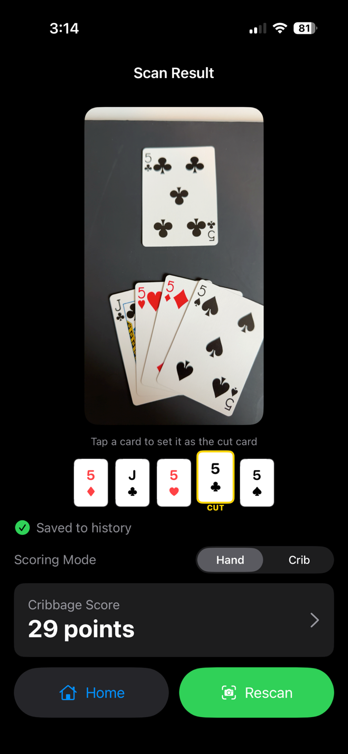 Lay out your cribbage hand with the cut card separated slightly. Point your iPhone at the cards and CribVision locks in each card as it’s detected. Once all five cards are identified, you get an instant score with a full breakdown of every scoring combination.