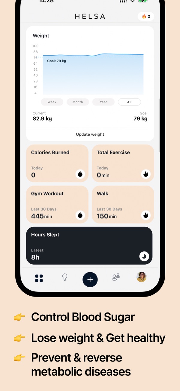 Let Helsa guide you with daily insights for weight loss, blood sugar control, preventing or reversing diabetes, A1C improvement, weight management, and overall better health & longevity.