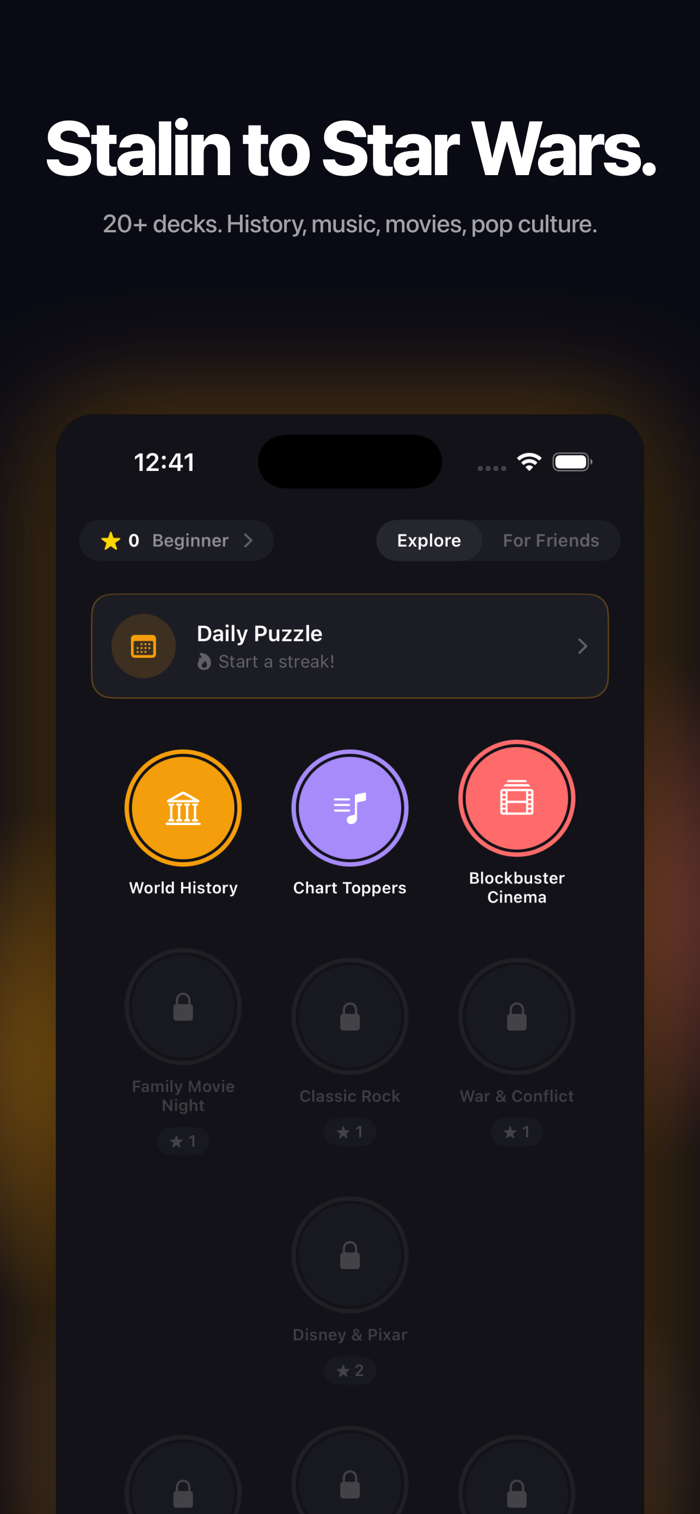 · 20+ DECKS: from World History and War & Conflict to Chart Toppers, Disney & Pixar, Blockbuster Cinema, Hip-Hop Chronicles, and more · DAILY PUZZLE: a fresh challenge every day, with streaks to build and beat