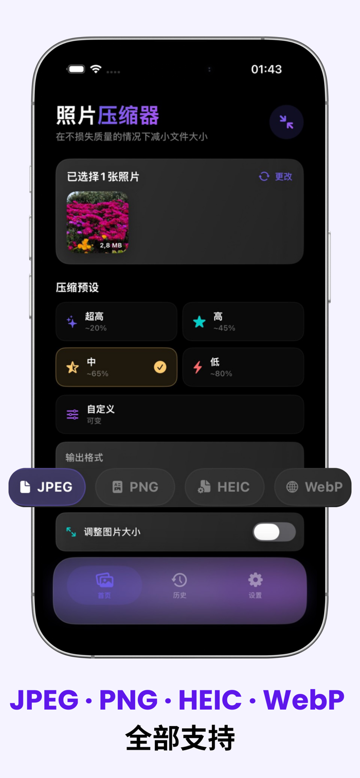 压缩 JPEG、PNG、HEIC 和 WebP 照片