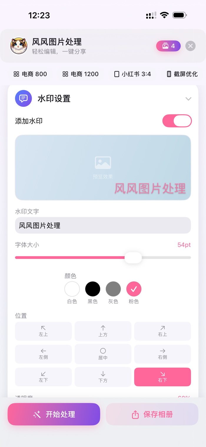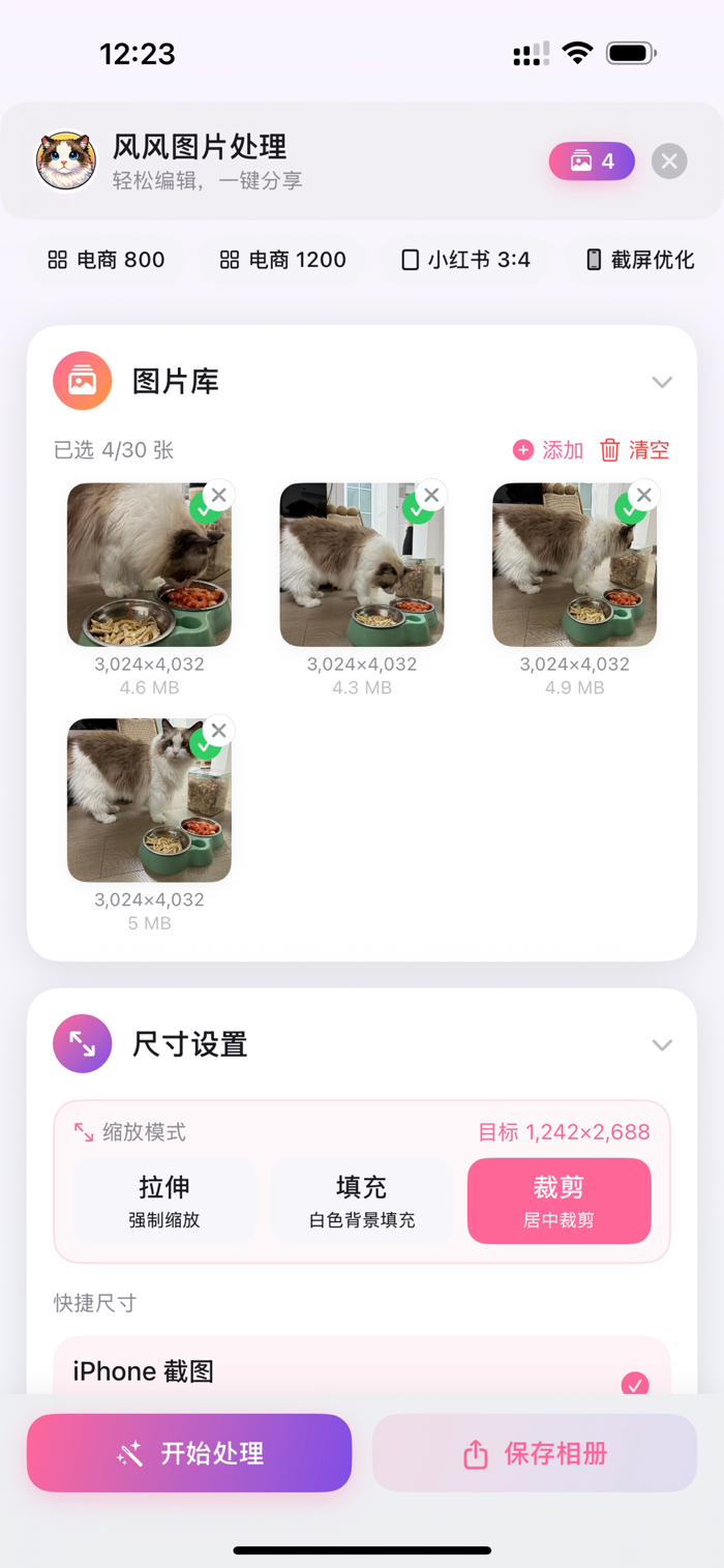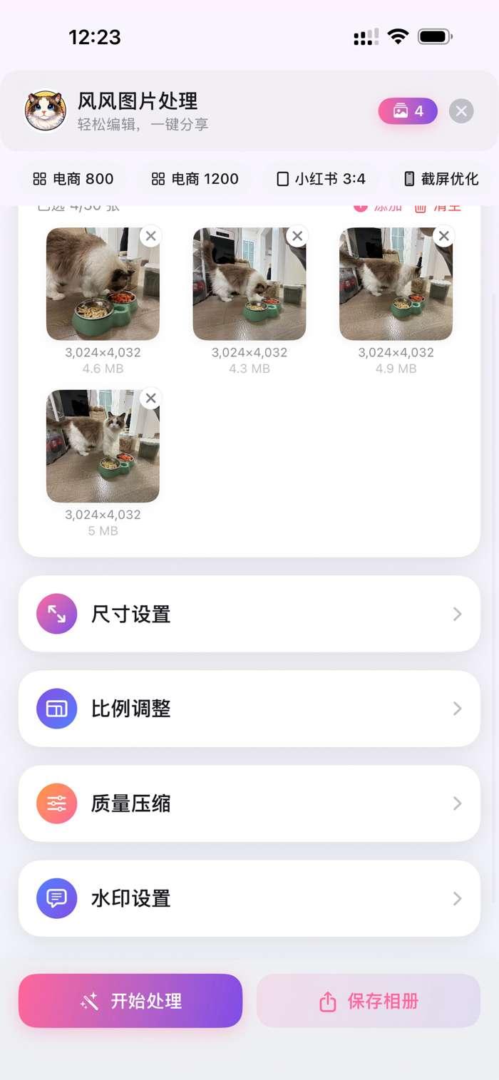 风风图片处理是简洁高效的本地批量图片处理工具。能批量导入一键处理多张图,可自定义尺寸裁剪拉伸,有多种预设模板。支持 JPEG/PNG/HEIC 多格式导出,能质量压缩控制文件大小。Pro 版有滤镜效果、智能压缩、清除元数据、自定义水印、精确裁剪等功能,批量处理上限提至 30 张。完全离线无广告追踪及第三方 SDK,一次购买永久使用。