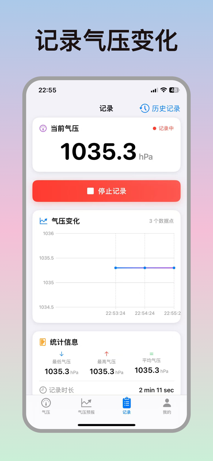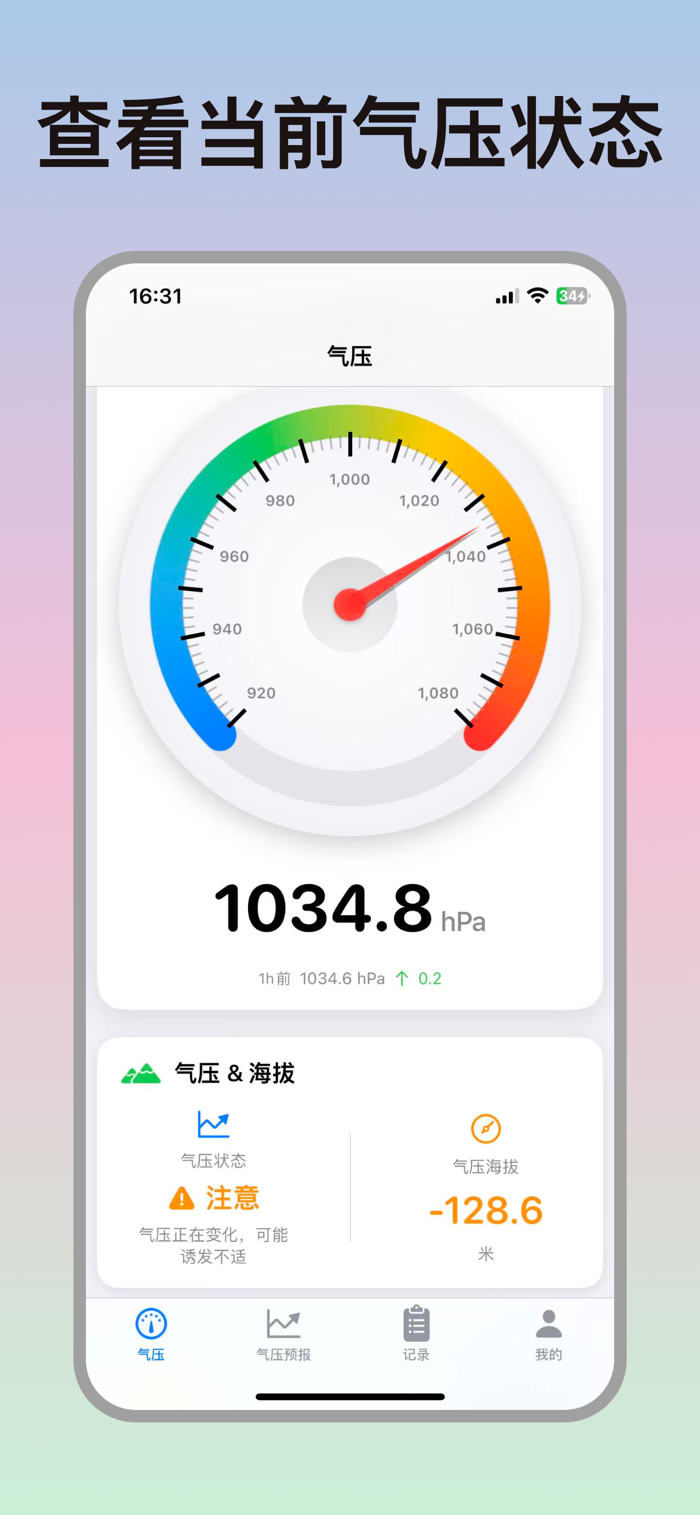 该应用专注气压监测与变化分析,能帮用户直观了解环境状态。主要功能有实时气压状态,可随时查看数值及趋势;智能变化提醒,气压波动时及时推送;偏头痛未来预警(参考);出海/钓鱼时间建议;多种模式偏好;气压变化记录。适合对气压敏感人群、关注偏头痛诱因者、户外活动爱好者及想理性规划日常的人,无需注册,不收集隐私信息。