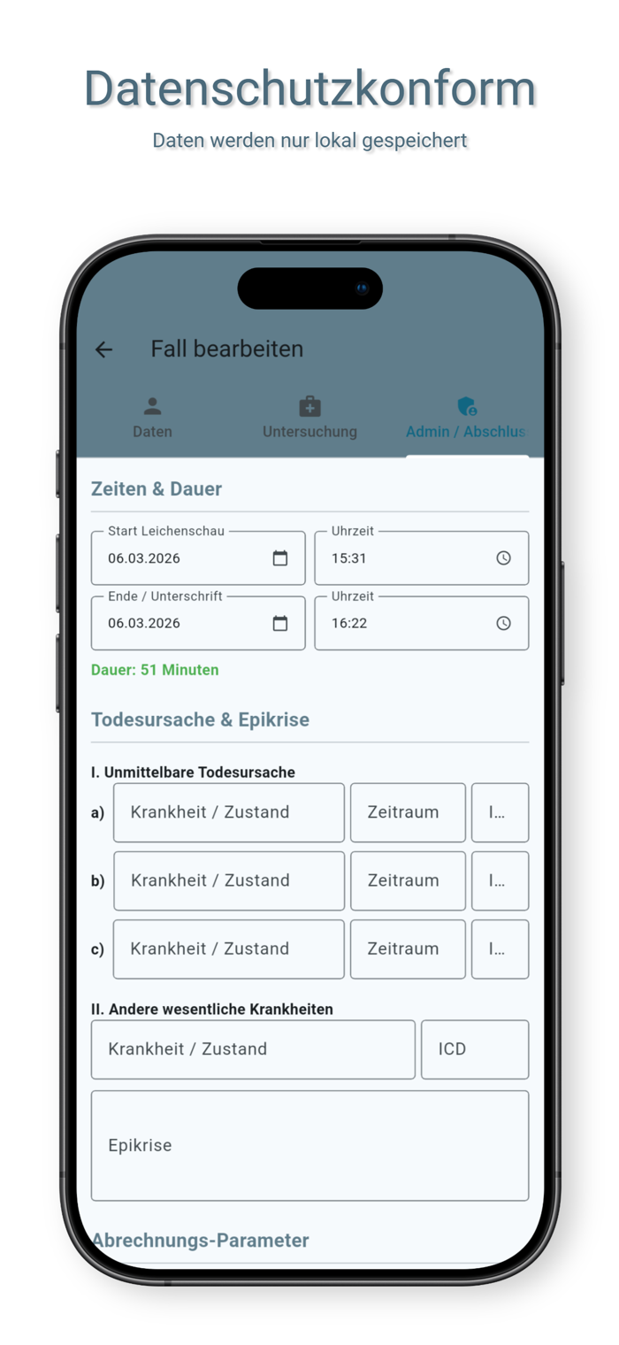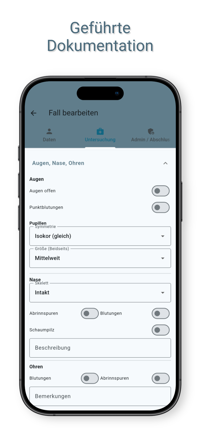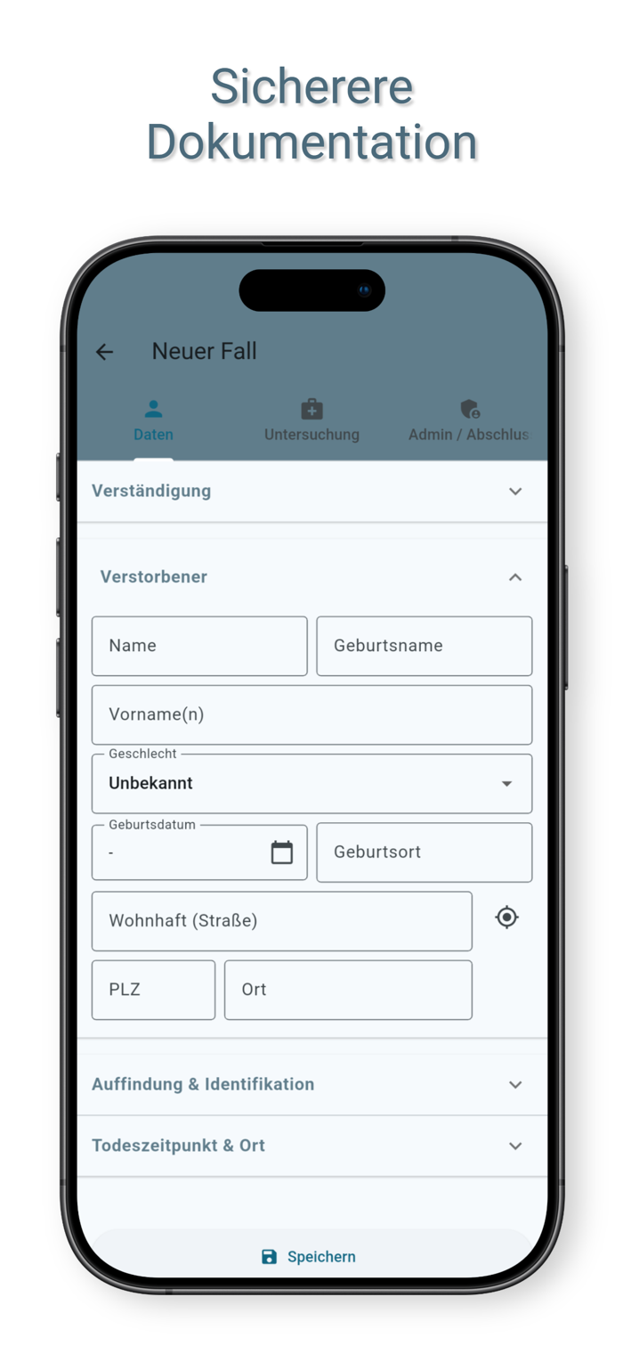 Geführte Dokumentation: Keine Zettelwirtschaft, kein Vergessen von wichtigen Details. Die App leitet Sie strukturiert und logisch Schritt für Schritt durch die gesamte Leichenschau. So dokumentieren Sie rechtssicher, präzise und effizient direkt am Ort des Geschehens.