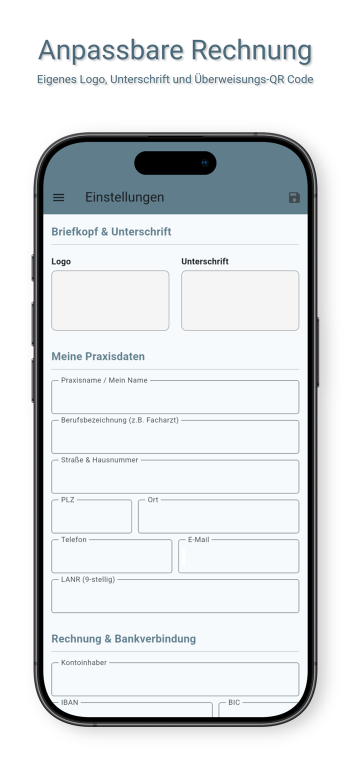 Individualisierbare Dokumente: Treten Sie absolut professionell auf. Sie können alle exportierten Dokumente – insbesondere Ihre Rechnungen – vollständig auf sich oder Ihre Praxis anpassen. Hinterlegen Sie mit wenigen Klicks Ihr eigenes Logo und Ihre digitale Unterschrift. Diese werden automatisch und nahtlos in jedes fertige PDF integriert.