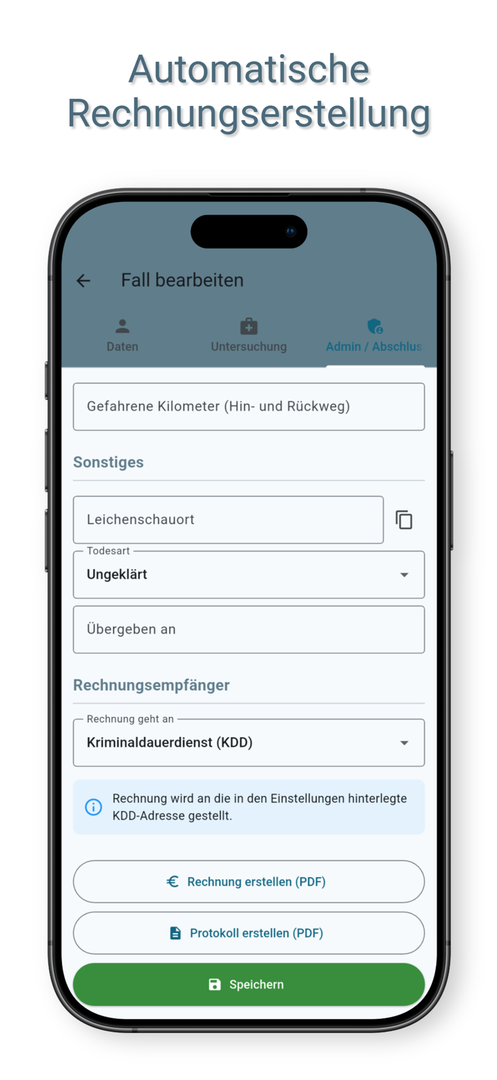 Automatische Rechnungserstellung in Echtzeit: Sparen Sie sich das lästige Tippen am Schreibtisch! In der exakten Sekunde, in der Sie die Dokumentation der Leichenschau in der App abschließen, ist die dazugehörige GOÄ-Rechnung bereits vollautomatisch für Sie generiert.