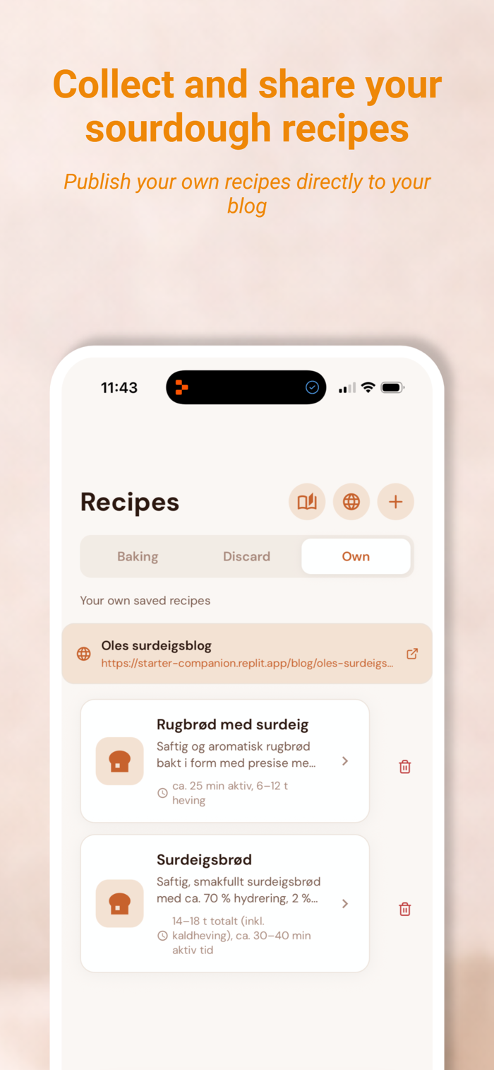 Browse a collection of sourdough recipes — from classic loaves to discard favorites like pancakes, waffles, crackers, and pizza dough. Built-in step timers keep you on track through every stage of the bake.
