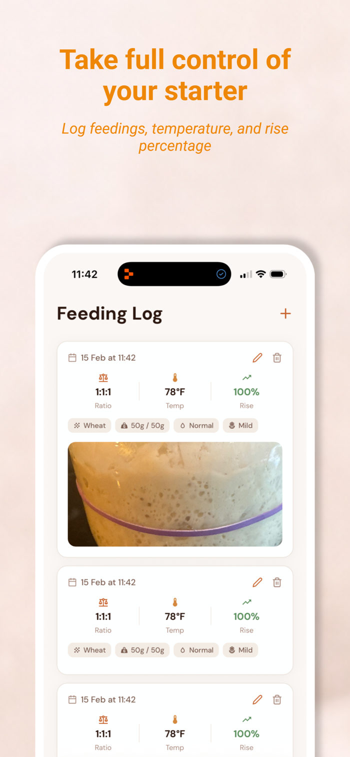Track your feedings with details like flour type, hydration, temperature, and rise percentage. Capture photos to monitor your starter's progress over time. See your starter's health at a glance on the dashboard.
