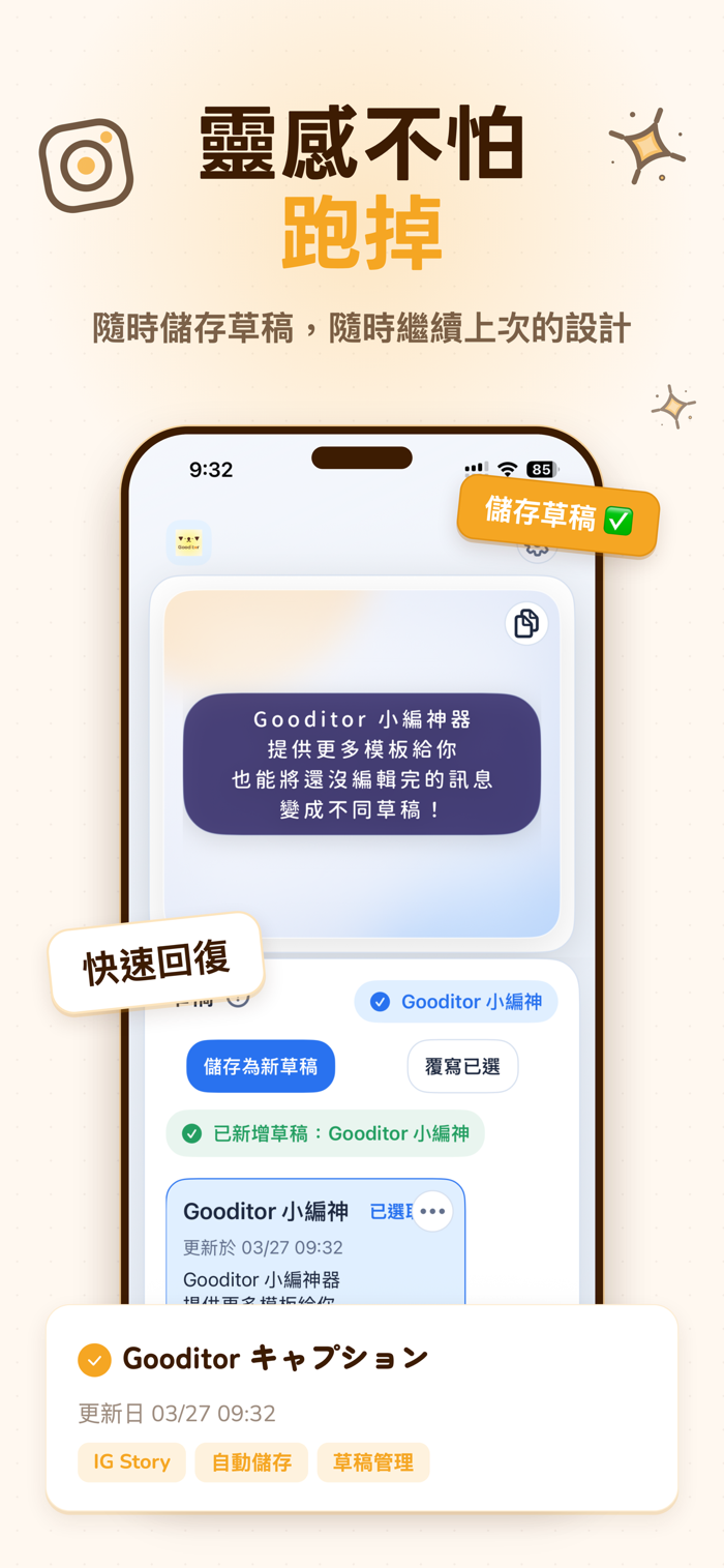 Gooditor 是专为 Instagram Story 与社交帖子打造的文字设计工具,帮助你在几秒内完成好看的排版,不再为字体、间距或风格烦恼。