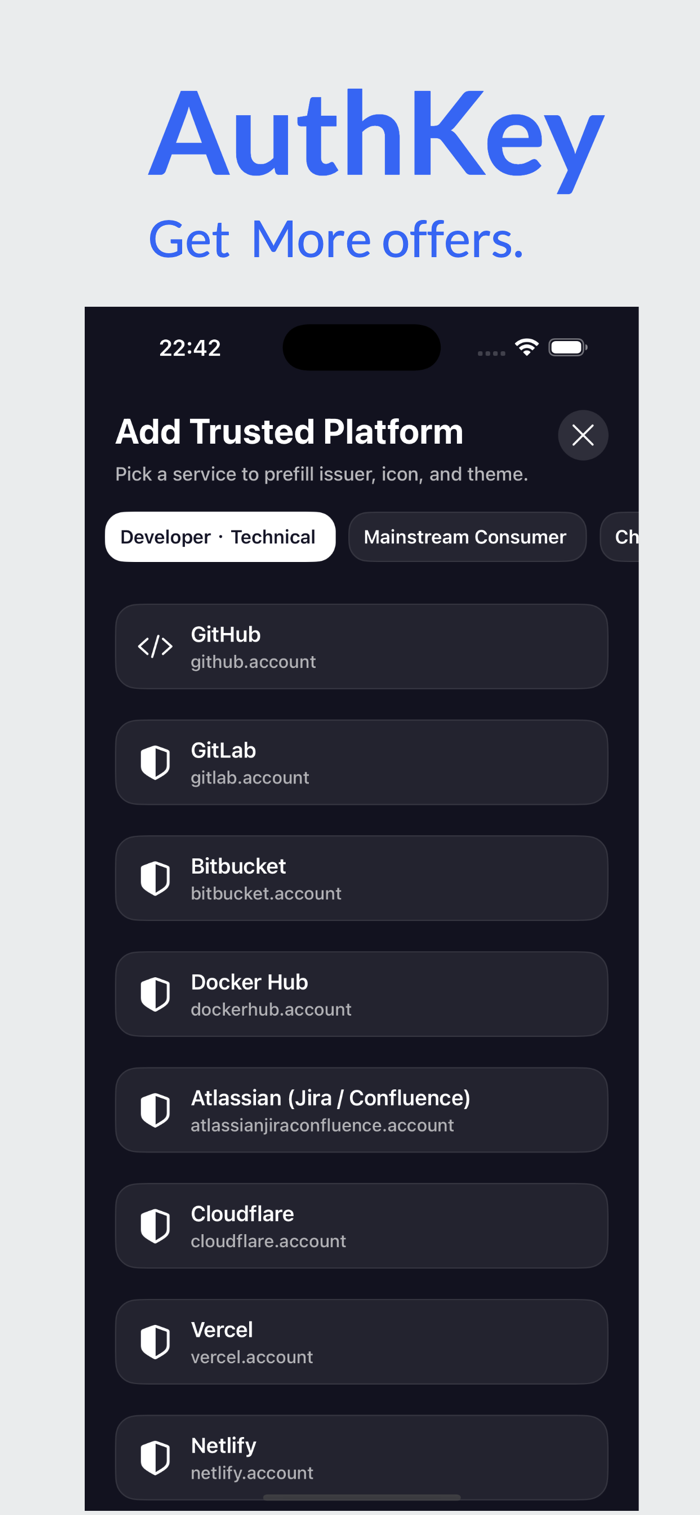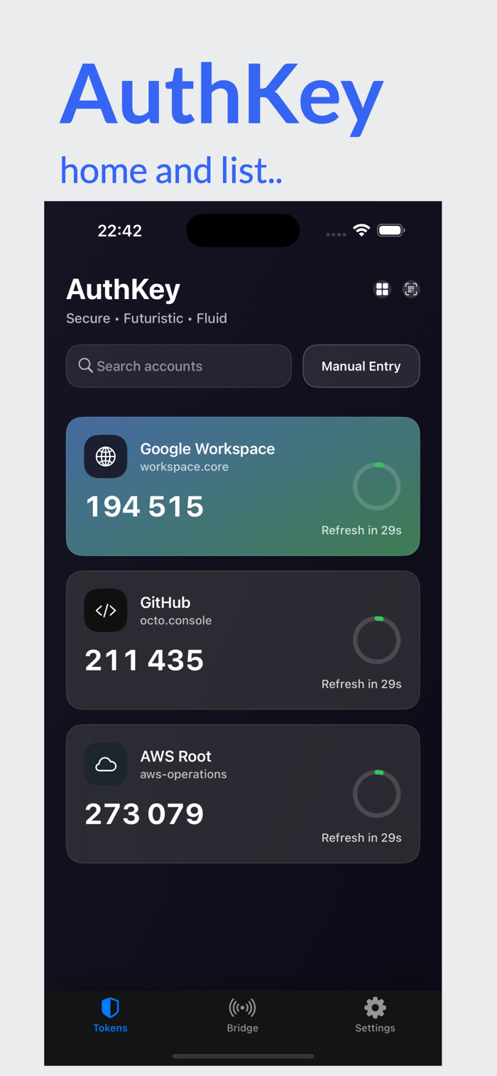 AuthKey是一款设备端2FA和OTP管理器,令牌和密钥本地存储,无需账户且不向服务器上传。可扫描二维码快速添加令牌,支持Face ID/Touch ID一键解锁。Bridge功能通过本地网络实现安全代码访问,支持多设备工作流程和自动化。无分析或广告SDK,提供加密导出和离线使用,保障隐私,体验简洁高效。