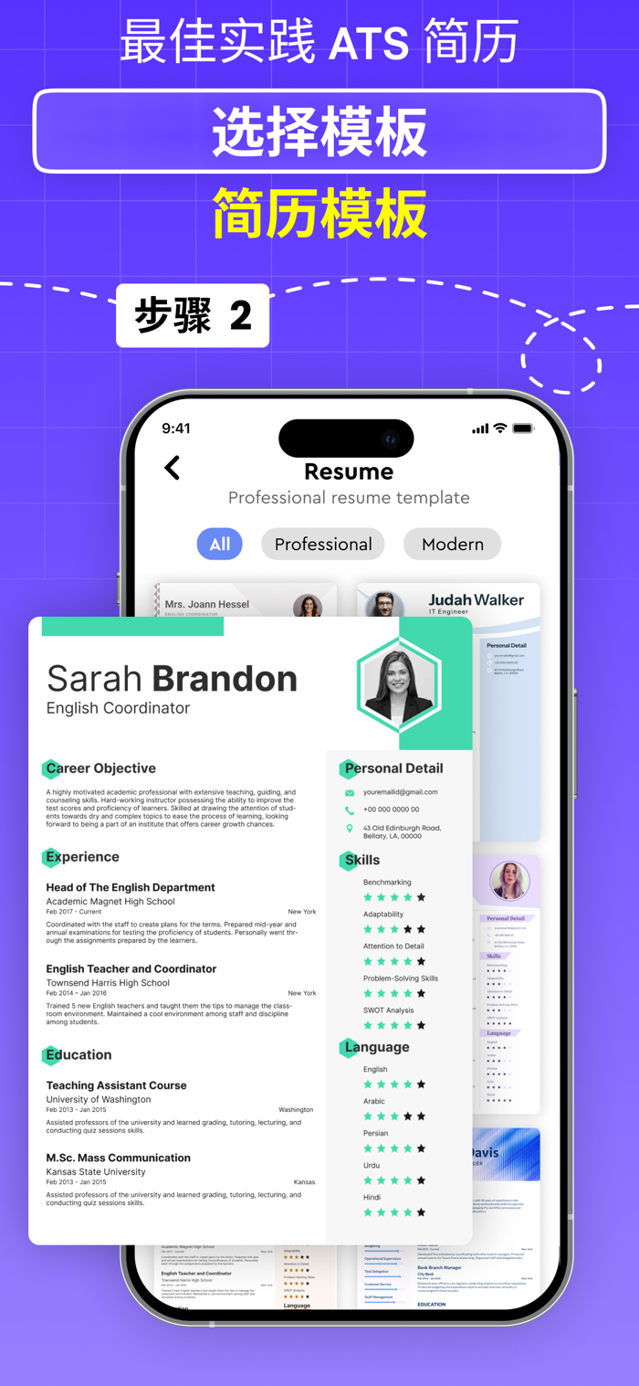 这款简历制作应用程序的突出之处在于它包含的简历模板种类繁多。每个模板都经过精心挑选,以适应不同的行业和职位。通过这款应用程序,您可以解锁各种选项,并选择最能展现您技能和经验的布局。