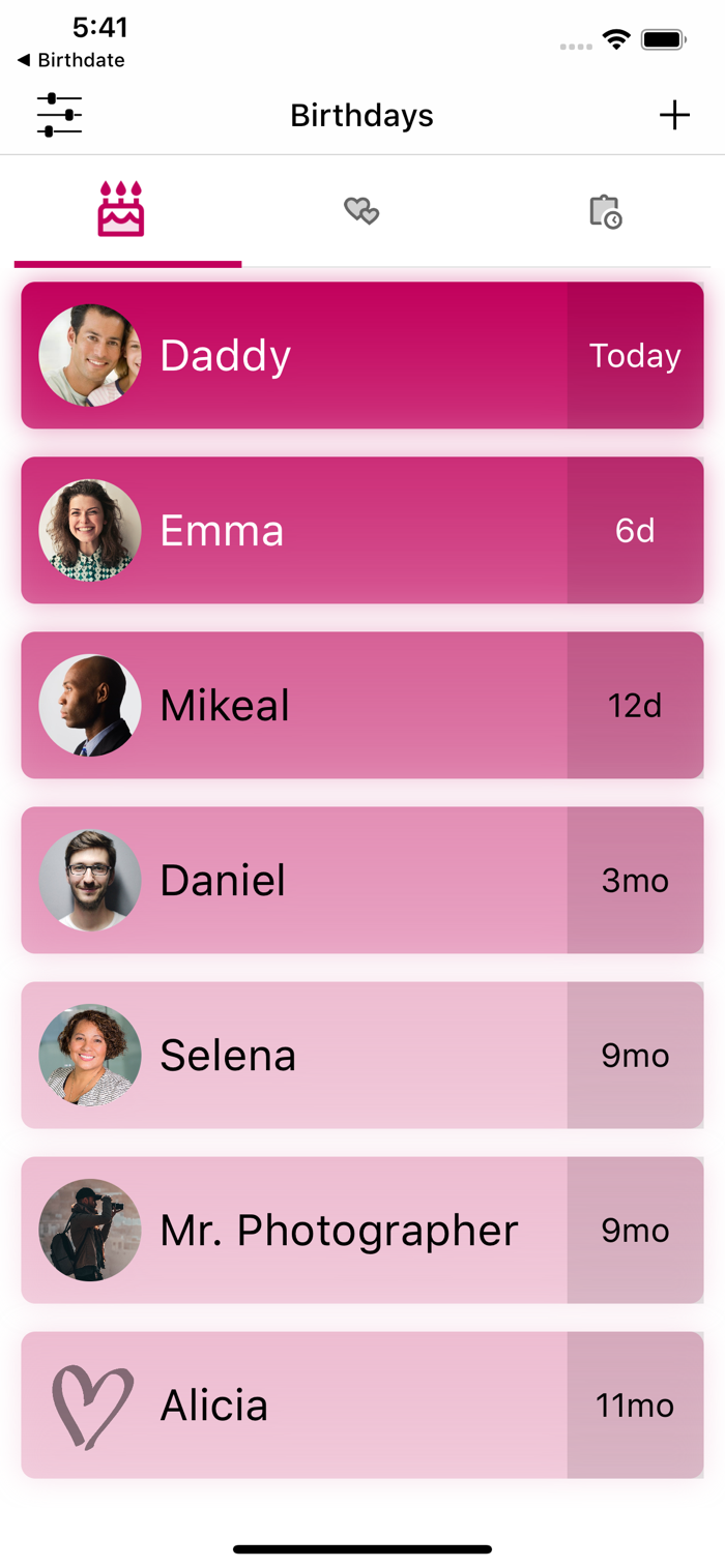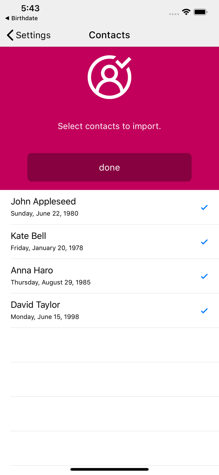 • import birthdays/anniversaries from contacts, tap settings on top left and choose contacts, then allow app to search your phonebook and then you see the result.
