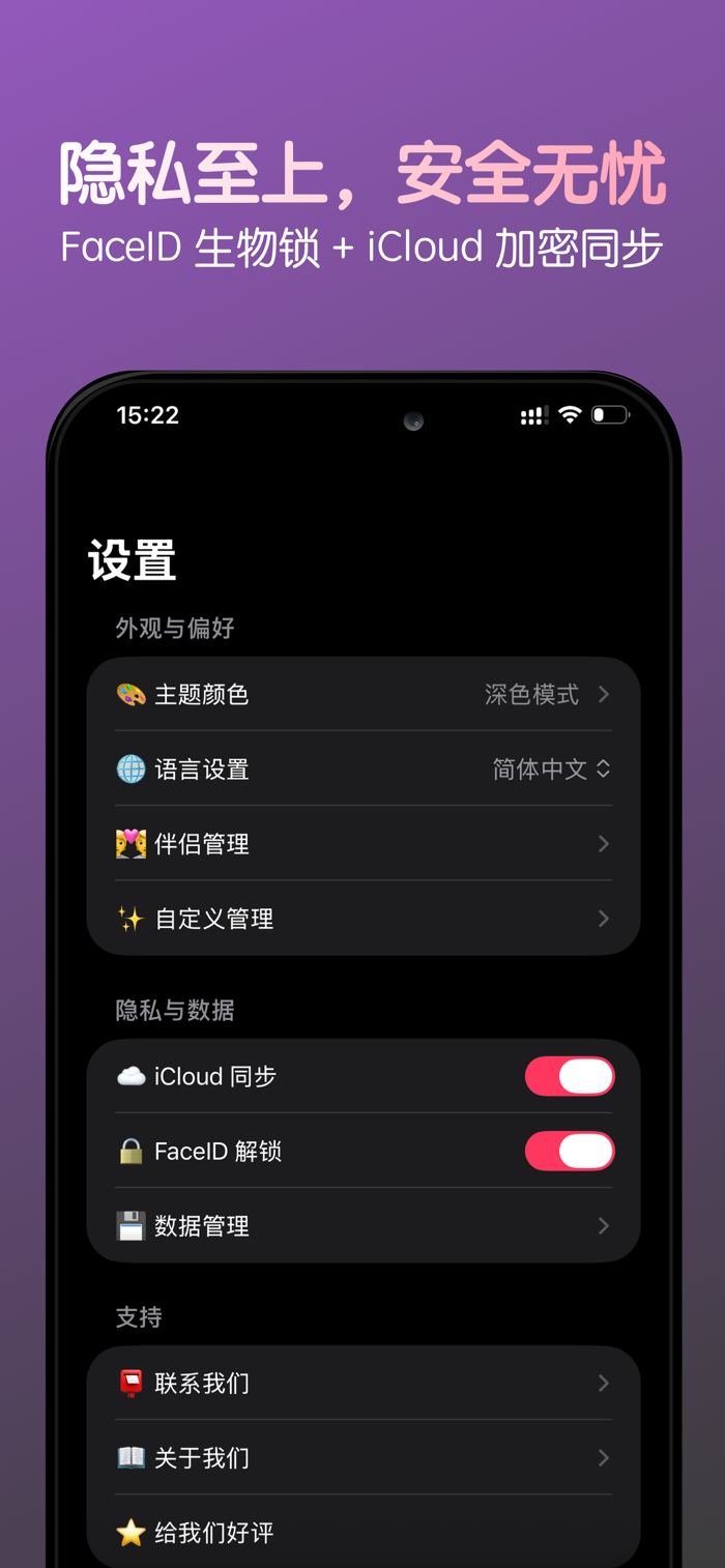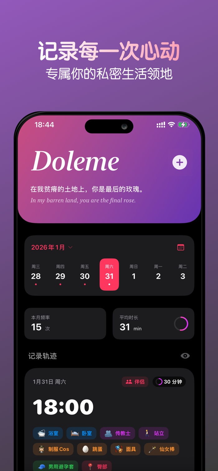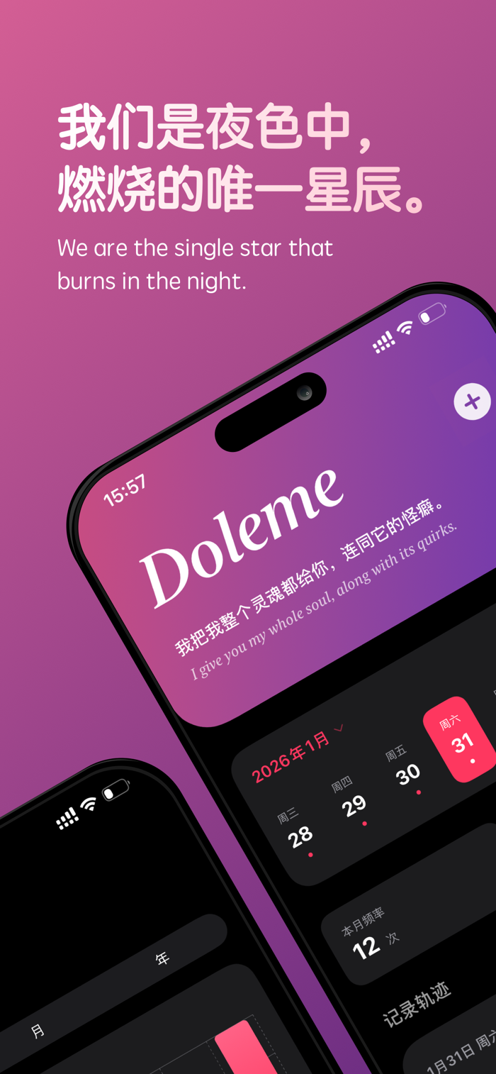 Doleme是私密领地,可卸下伪装记录真实感受。有全维度细节记录功能,如高度自定义标签系统、支持伴侣与Solo多场景、沉浸式过程计时;多维数据可视化,能生成深度偏好统计等;还有专属个性化体验,包括深浅主题配色、原生多语言支持。同时采用严苛隐私策略,如一键脱敏、数据自由迁移、iCloud加密同步、FaceID生物锁,保障数据安全。
