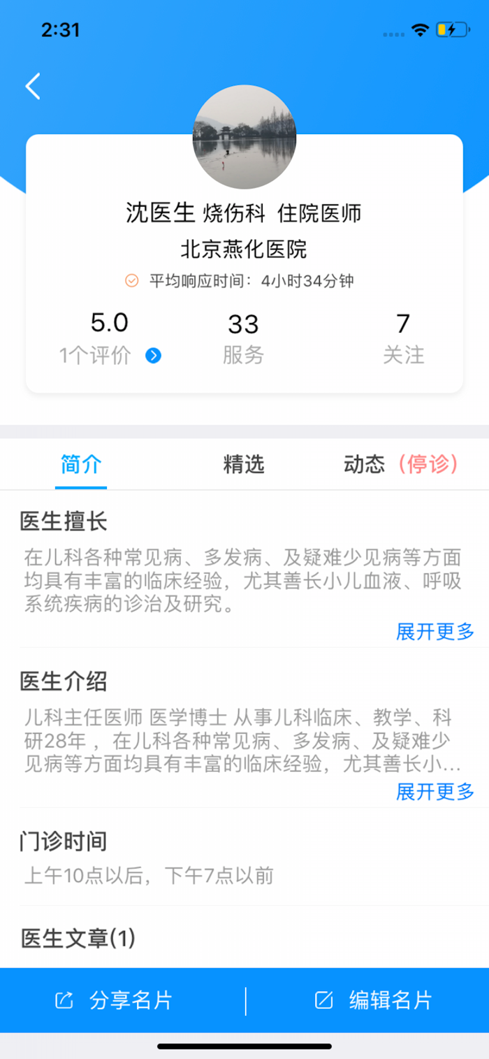 北京燕化医院(医护版)助力医生进行患者个人与分组管理,支持图文、视频咨询,可发布文章并查看患者评价,还能自助管理服务价格与规则,方便医患交流提升满意度,同时帮助护士提供上门服务。