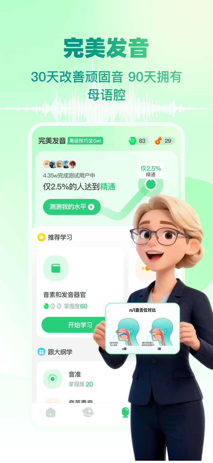 2. 发音不自信:“完美发音”从音标开始系统性纠音,配合AI对话实时反馈,精准改进。