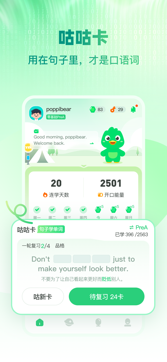 1. 词汇≠开口能力:通过“咕咕卡”模块,用地道句子激活高频词汇,让单词真正能用出来。