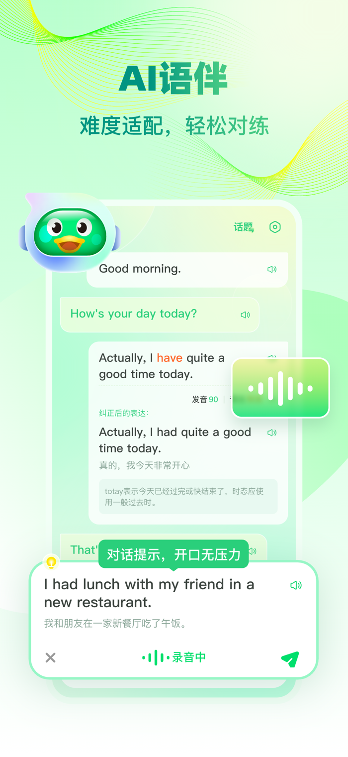 - 更专业的AI语伴:不止“陪练”,会根据你的水平适配语速和话题的专业口语搭子,让开口无压力,训练更有效。