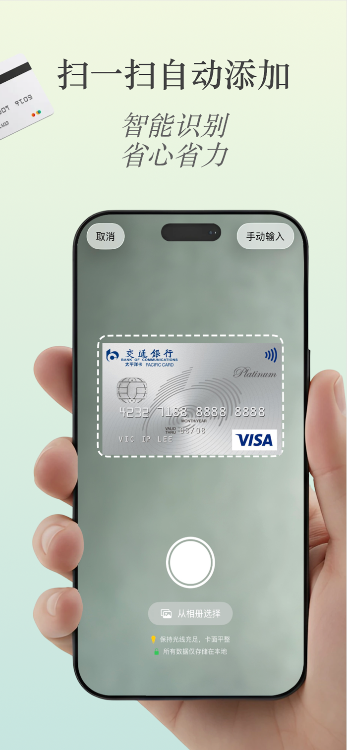 • 隐私壁垒,数据完全离线 我们坚持“数据不离机”原则。无需注册账号,无需绑定网银。您的所有敏感卡片信息均采用银行级标准加密,并仅存储于您手机的本地安全芯片中。您的财务隐私只属于您自己,绝无上传风险。