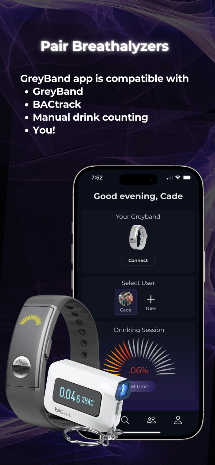 GreyBand可与呼气酒精含量探测器相连,用于追踪酒精含量水平,助力培养健康习惯,让夜生活更愉快。它能让你随时了解自身情况,保障安全并享受乐趣。
