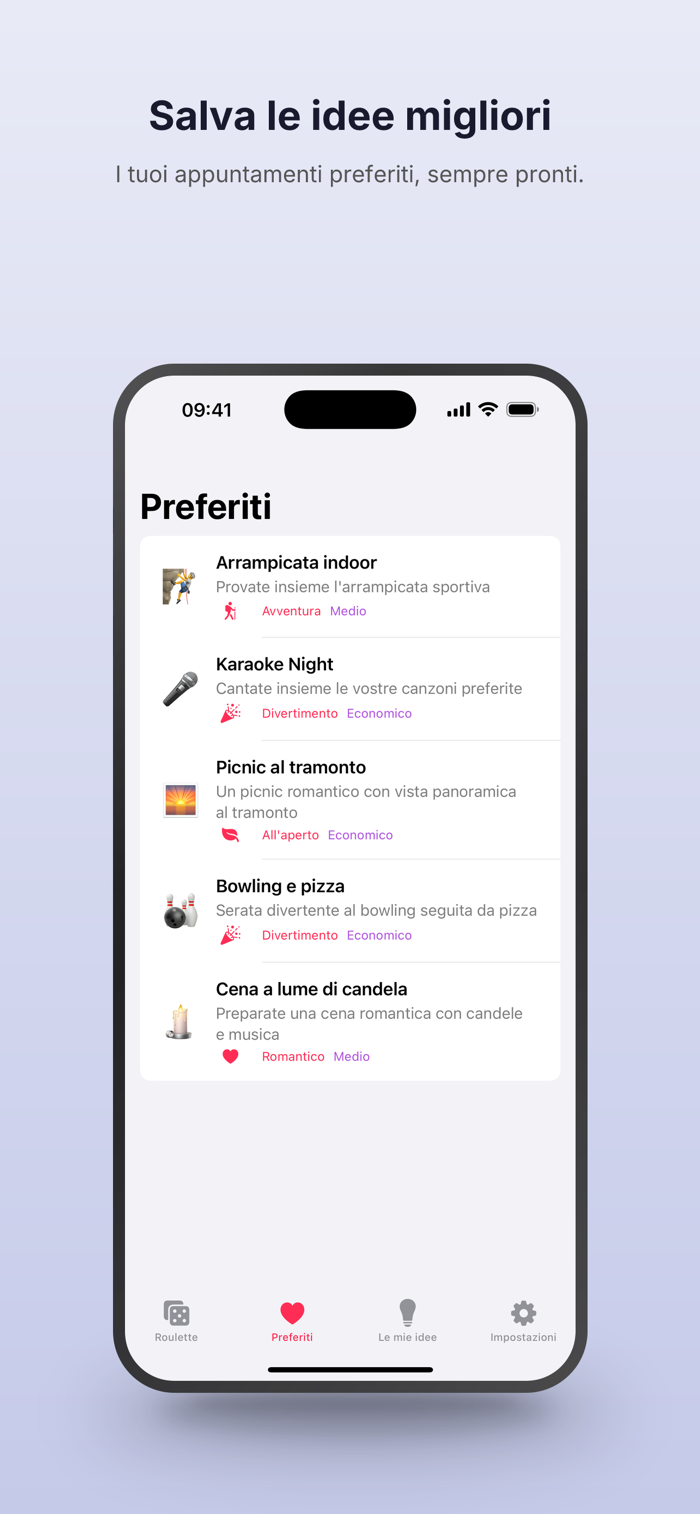 • Seleziona le categorie: Atmosfera, Avventura, Casa, All'aperto, Divertimento