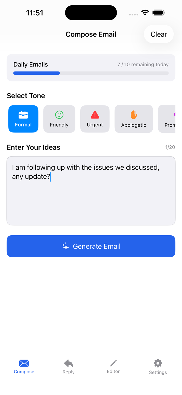 Choose from Formal, Casual, Friendly, or Professional. MailMind adjusts the tone to match your audience.