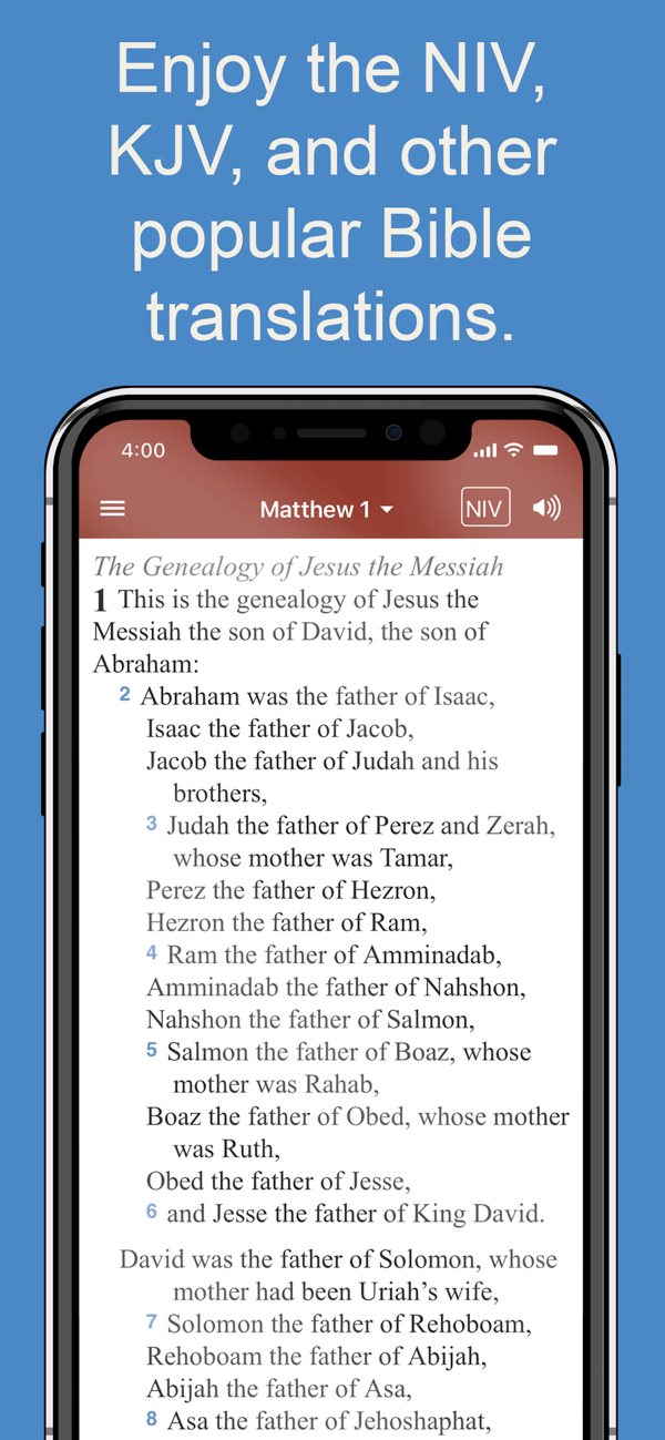 • 200+ Bible translations, including NIV, KJV, ESV, NKJV, NASB, AMP, and MSG