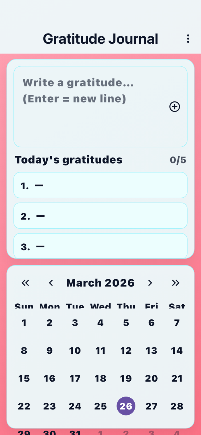 Gratitude Journal helps you build a simple daily habit of appreciation. Write up to 5 gratitudes each day, keep them saved by date, and revisit past entries anytime in the built-in calendar.
