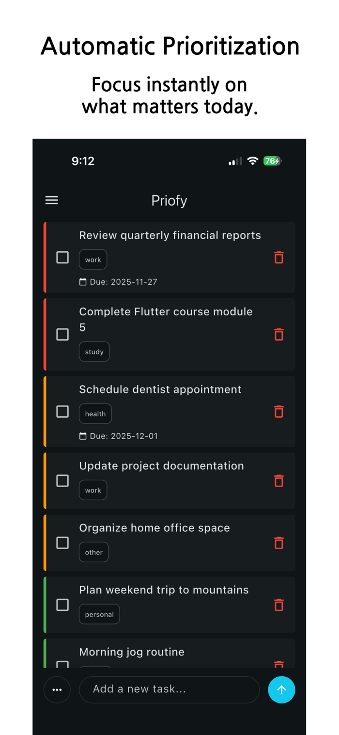 Priorify是一款待办应用,其设备端AI可自动整理任务。它能减少每日“该先做什么”的犹豫,助您直接行动。具备AI驱动的自动优先级排序,分析任务并将最重要或紧急的置顶;自动类别检测,自然理解任务性质并自动分类,无需手动选择;100%设备端AI,排序、分类及推荐全在本地完成,无需网络,不向服务器传输数据,内置隐私保护,不收集传输用户数据,所有AI功能全离线运行。