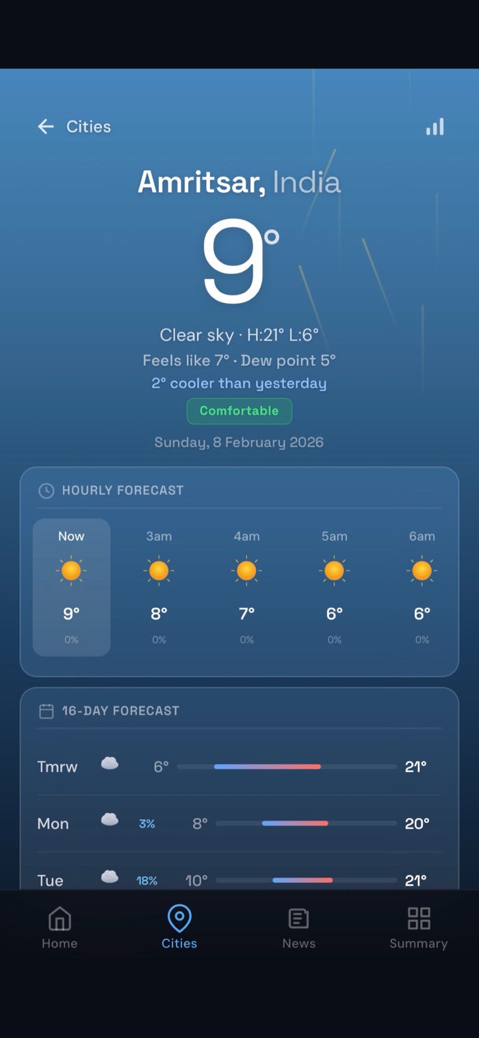 • Detailed city weather: current conditions, hourly forecast, and 16-day outlook